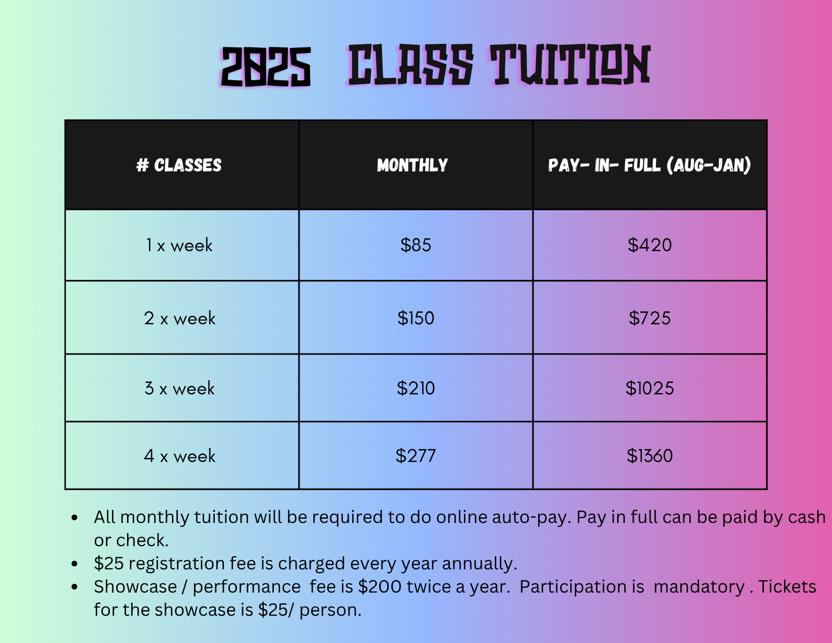 Aug 22nd- Aug 24, 2025- Studio Closed for Vegas show/ all classes will be canceled. Tuition has been calculated with pro-rate for this weekend.